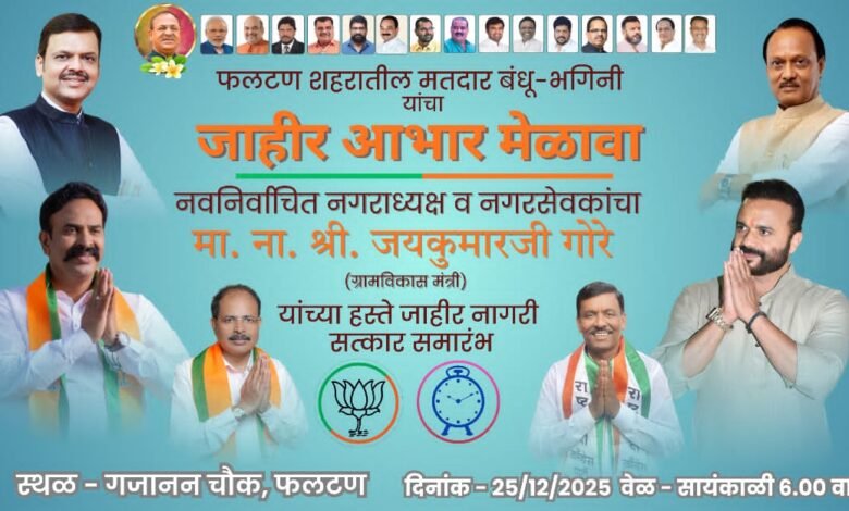 मतदारांचे जाहीर आभार तसेच भाजप राष्ट्रवादी काँग्रेसचे नवनिर्वाचित नगरसेवकांचा सत्कार राज्याचे ग्रामविकास मंत्री जयकुमार गोरे यांच्या शुभहस्ते माजी खासदार रणजितसिंह नाईक निंबाळकर,आमदार सचिन पाटील,ज्येष्ठ नेते प्रल्हादराव साळुंखे पाटील,माजी नगराध्यक्ष दिलीपसिंह भोसले यांच्या प्रमुख उपस्थितीत होणार आहे.