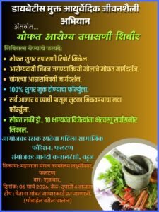 या शिबिरामध्ये रक्ताची मोफत तपासणी करून आरोग्यदायी जीवन जगण्याविषयी मोलाचे मोफत मार्गदर्शन करण्यात येणार आहे. मधुमेह रुग्णांना 100% शुगर मुक्त होण्याचा फार्मूला सांगण्यात येणार असून आत्तापर्यंत जे शुगर मुक्त झाले आहेत त्यांचे पण अनुभव खास सांगण्यात येणार आहेत. सध्या बरेच जण शुगर{ डायबिटीस } मुळे त्रस्त आहेत शुगर मुक्त होण्यासाठी हे शिबिर महत्वाचे ठरणार आहे. सर्व आजारावर सुद्धा मोफत मार्गदर्शन करण्यात येणार आहे. तज्ञांचे मोफत मार्गदर्शन यावेळी सर्वांना मिळणार असून उपस्थित लोकांमधून १० लकी ड्रॉ काढण्यात येणार आहेत . सर्वांनी या कार्यक्रमास मोठ्या संख्येने उपस्थित रहावे. अधिक माहितीसाठी मोबाईल 9890795979 व 9822229526